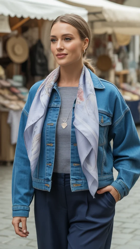 Add personality to your casual denim jacket look with a soft printed scarf and a striped top. This little styling detail instantly makes a simple outfit feel thoughtful and put together.
