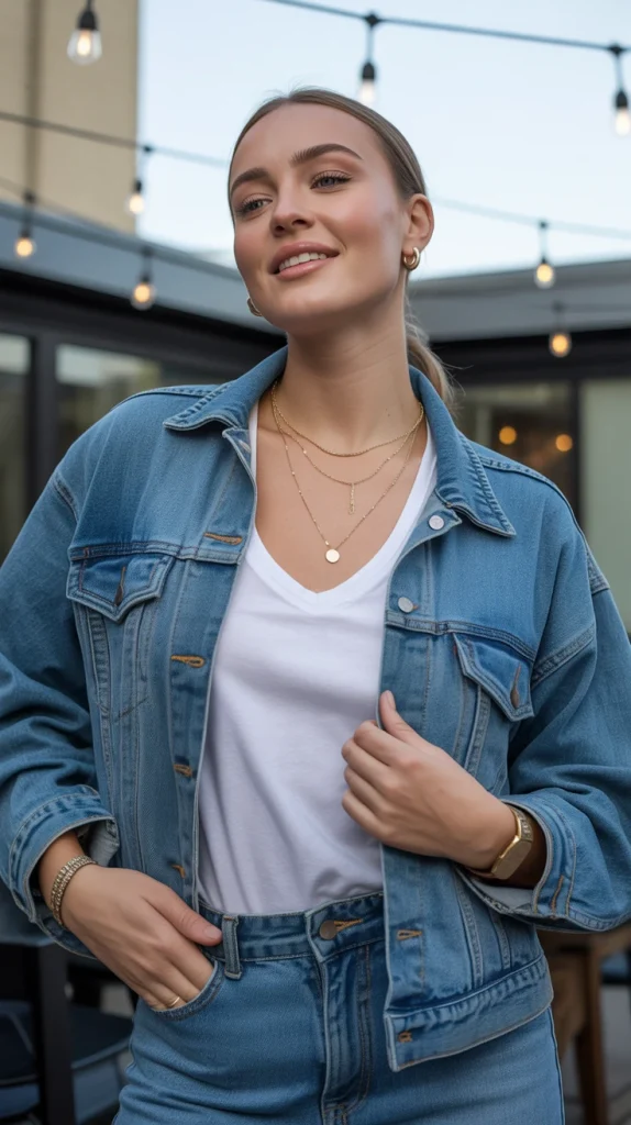 You can’t go wrong with the ultimate casual denim jacket combination a clean white tee, straight blue jeans, and sneakers. This is the easy, everyday formula you can wear to brunch, the park, or a coffee run.