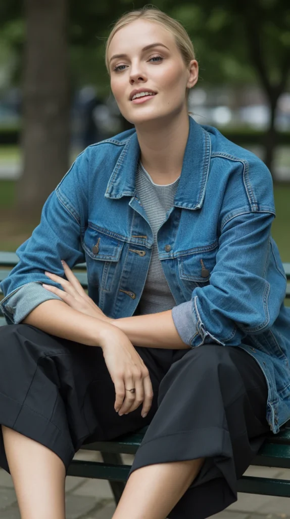 A baseball cap, cropped trousers, and slip-on sneakers paired with your denim jacket create a sporty streetwear feel. Perfect for busy days when you still want to look coordinated.