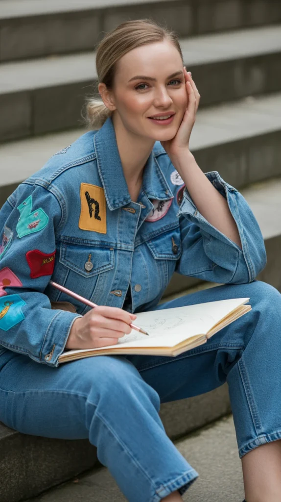 Add your own personality to a blue denim jacket by decorating it with colorful patches. Paired with cropped jeans, it’s a playful and unique take on casual denim jacket style.