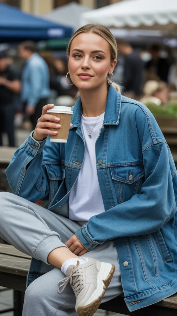 An oversized denim jacket over a white tee and grey joggers is comfort done right. It’s one of those denim jacket looks you’ll throw on for errands, travel days, or relaxed weekend hangouts.