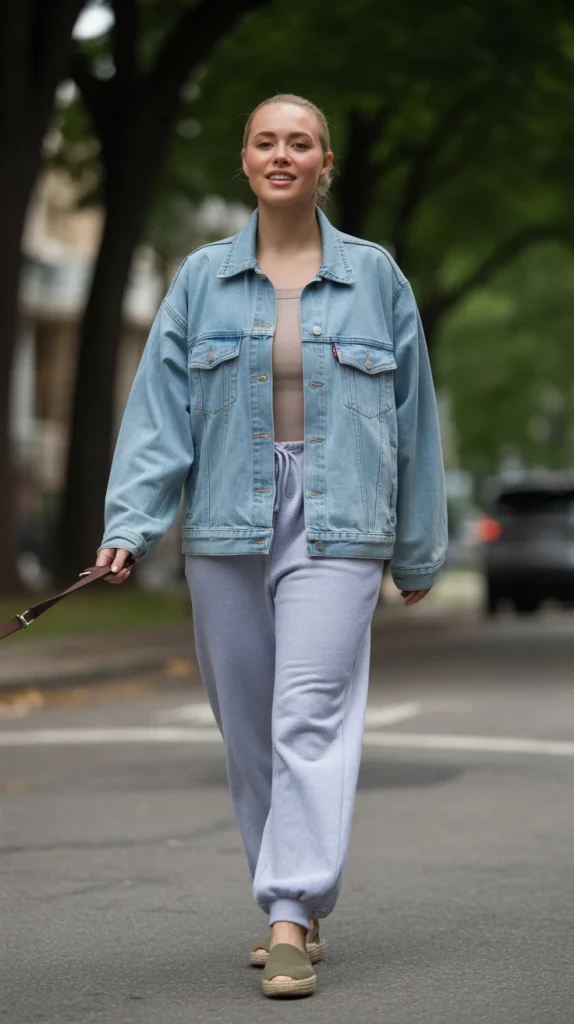For elevated lounge style, try a light jean jacket outfit with soft grey sweatpants and espadrilles. It’s cozy yet polished enough for a casual lunch or strolling around the neighborhood.
