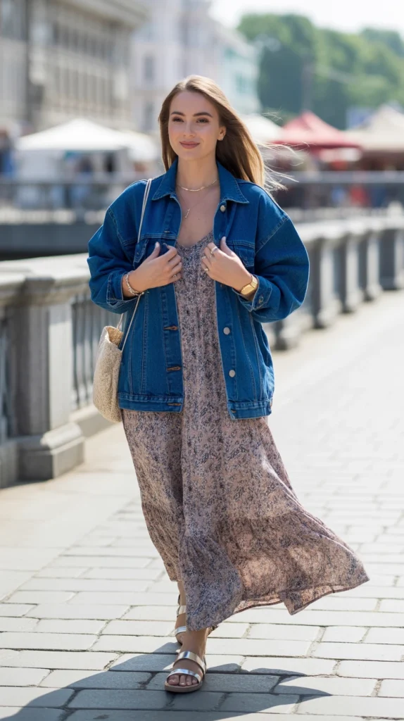 Layer a mid-wash denim jacket over a flowing bohemian maxi dress for an effortless denim fall outfit. Add sandals in summer or boots in autumn for a look that works across seasons.