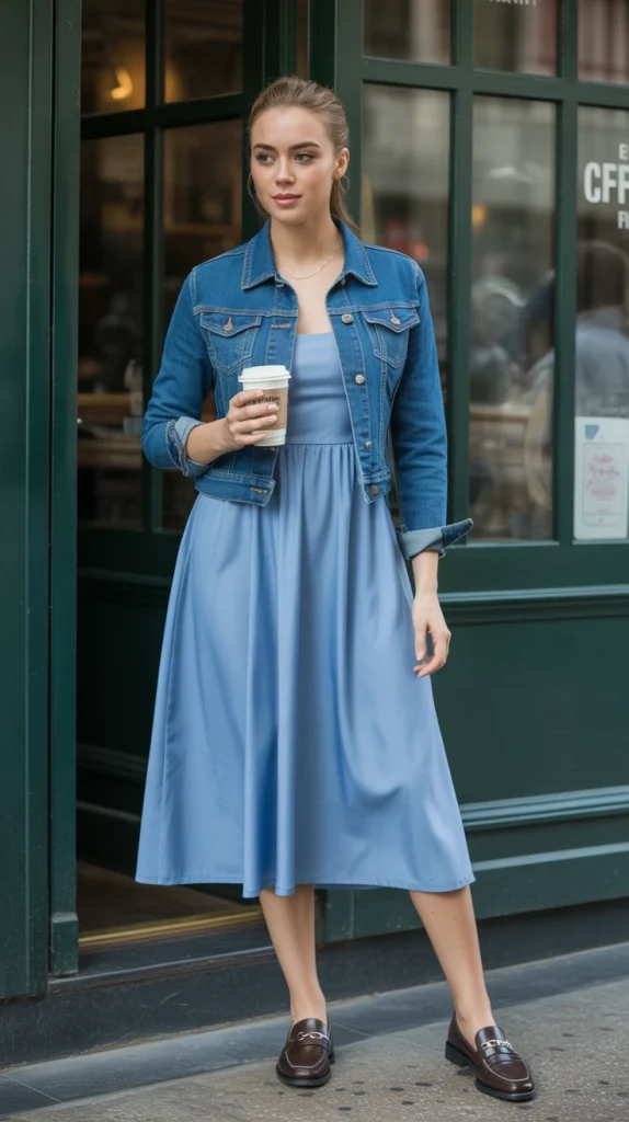 For a feminine yet functional look, layer a fitted denim jacket over a midi dress and add loafers. This outfit is perfect for casual office days or weekend gatherings.