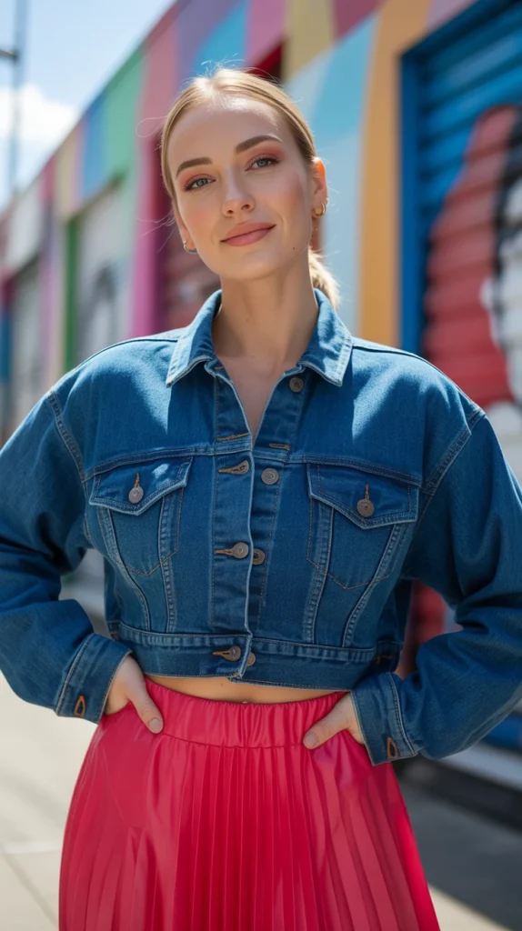 A cropped denim jacket paired with a bold red pleated skirt creates a striking color contrast. This is a great example of how denim jacket looks can add balance to statement pieces.