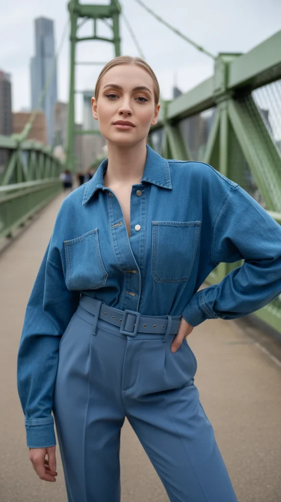 Button up your blue denim jacket and cinch it at the waist with a belt for a fashion-forward twist. Paired with slim trousers, this outfit is chic enough for casual meetings or dinner dates.