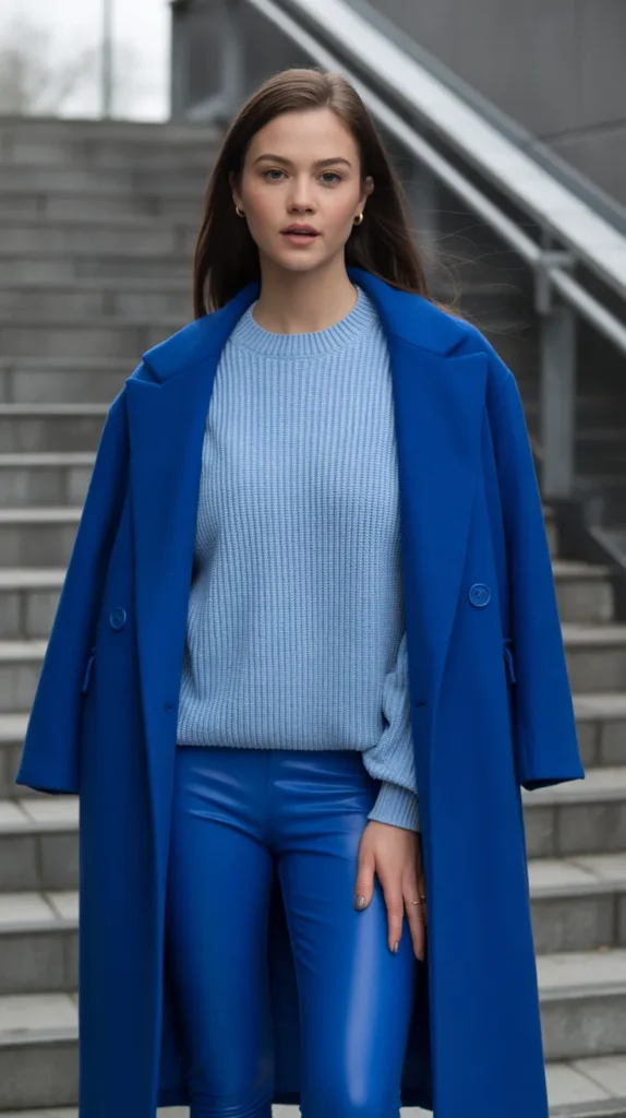 Mix navy leggings with lighter shades like powder or cobalt blue for a tonal, editorial effect. A structured coat or long knit in a similar palette creates instant depth. This layered approach makes your lazy outfits look purposeful and expensive no effort required.