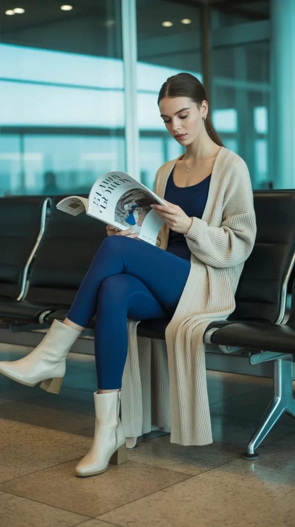 Navy leggings topped with a cream longline cardigan and a ribbed bodysuit create a chic winter-ready combo. The belted waist adds definition while keeping it cozy and breathable. This outfit is ideal for long flights, coffee dates, or work-from-home days that need a touch of polish.