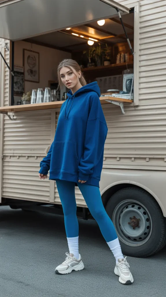 A deep blue hoodie layered over matching leggings makes cozy coordination look stylish. Chunky sneakers and tall socks peeking out from the hem give it a trendy, youthful edge. Perfect for lazy Sundays or grocery runs, this outfit nails the cute comfy outfits vibe effortlessly.