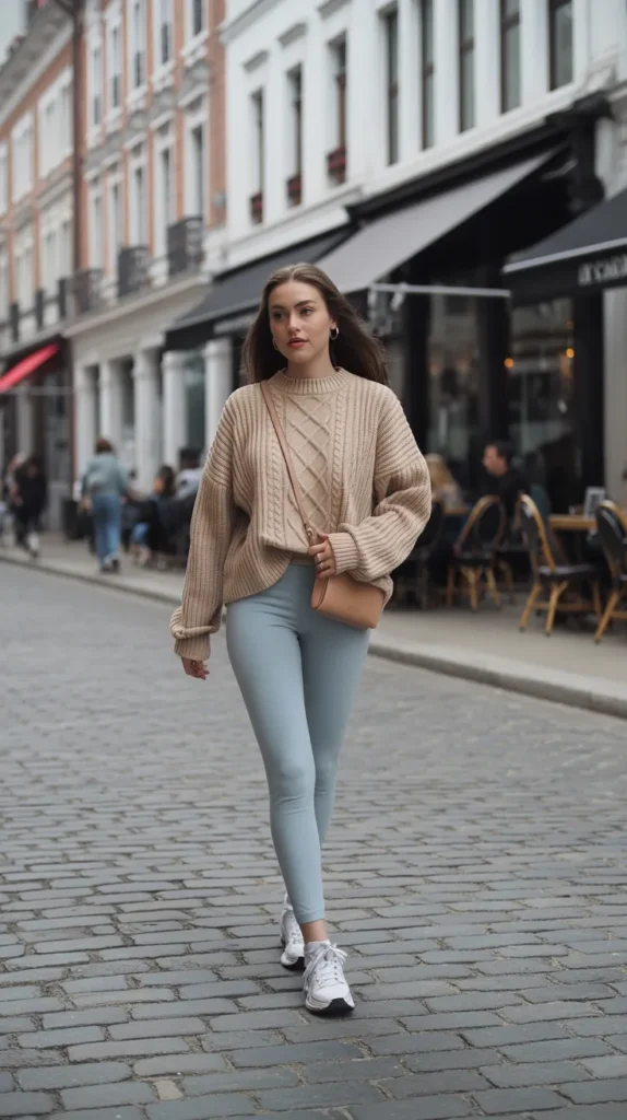 Light blue leggings with a beige cable-knit sweater feel clean, cozy, and slightly Scandinavian. The half-tuck adds just enough structure, while platform sneakers keep it fun and modern. A tan crossbody completes this minimalist girl aesthetic cozy without being plain.