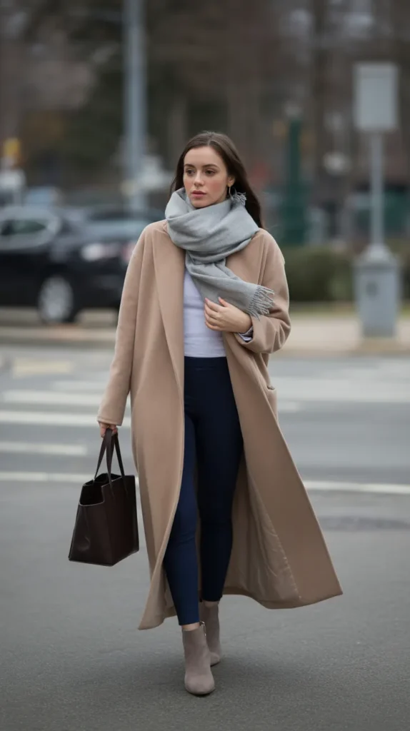 4. Beige Coat and Grey Scarf Combo