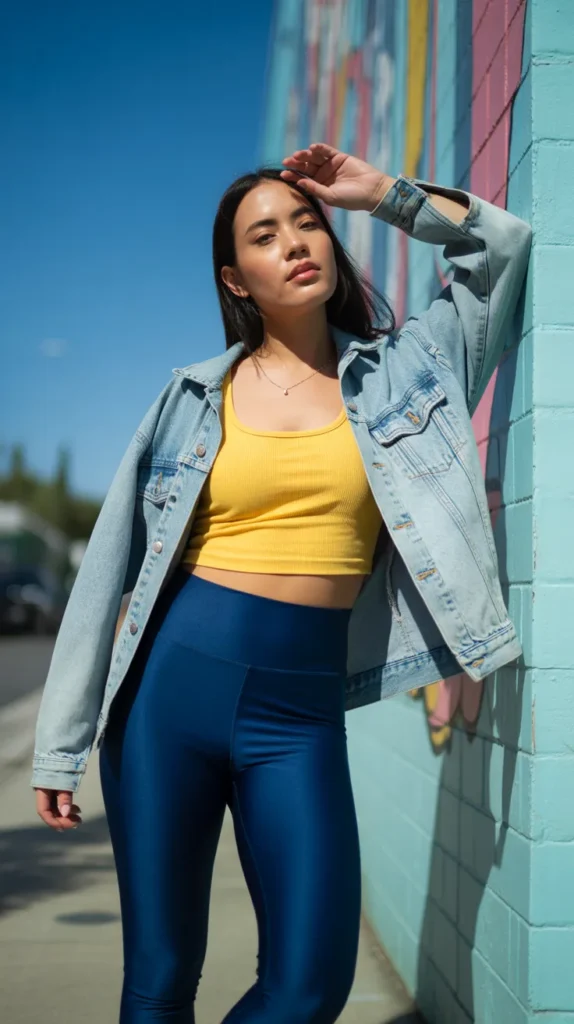 Pair your navy leggings with a bright cropped top for a burst of color and personality. A light-wash denim jacket tones it down just enough to keep it wearable. This look brings lazy outfit inspo to life casual, confident, and full of energy.