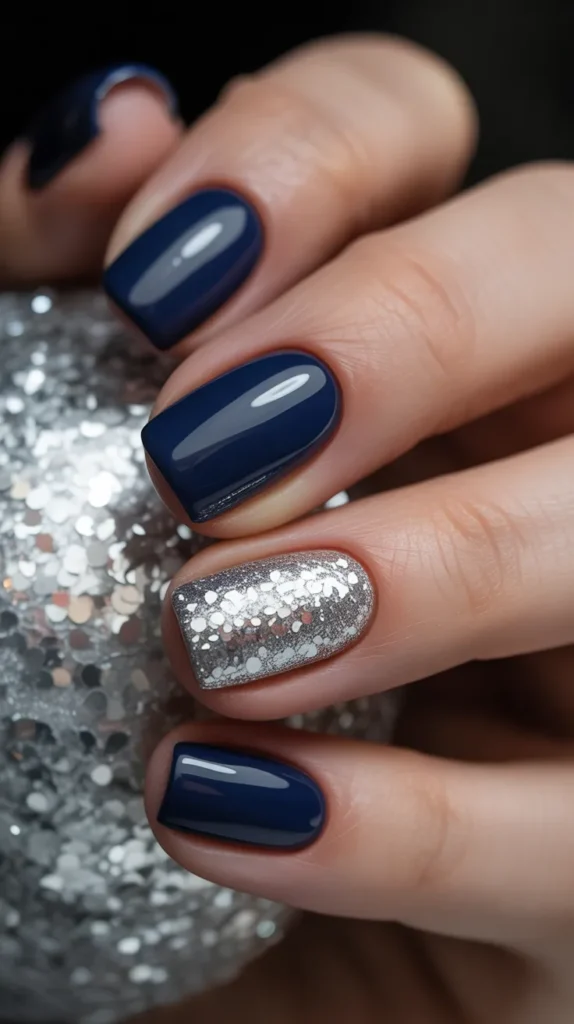 Metallic glitter accents instantly level up navy blue nails. A single silver glitter nail adds that “just enough” contrast to keep things interesting. It’s bold yet balanced the perfect mix of classy and fun. 💅