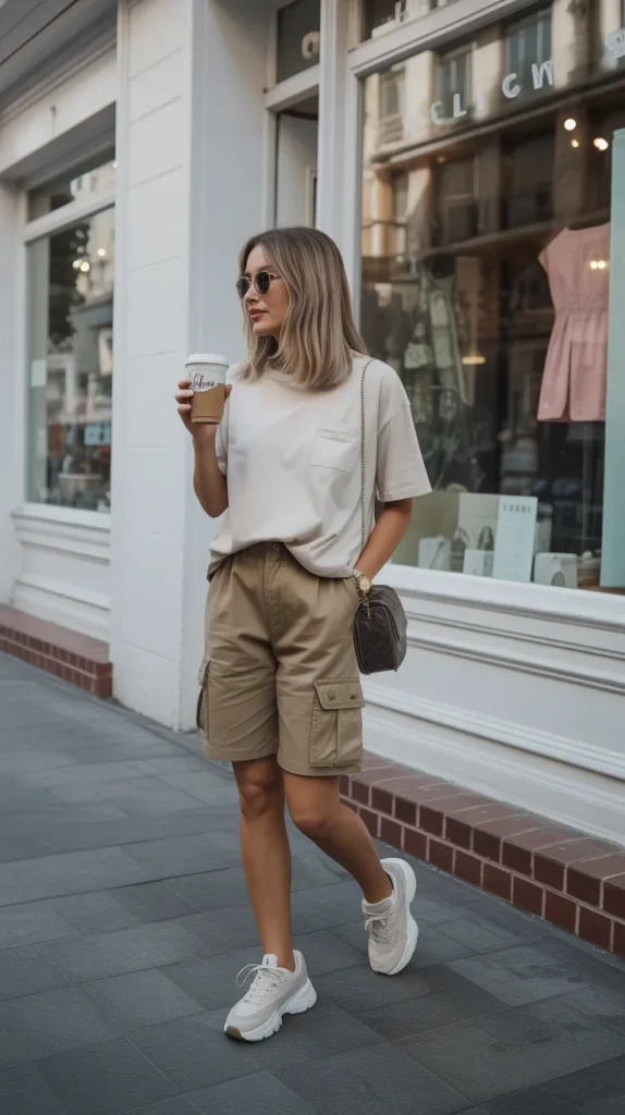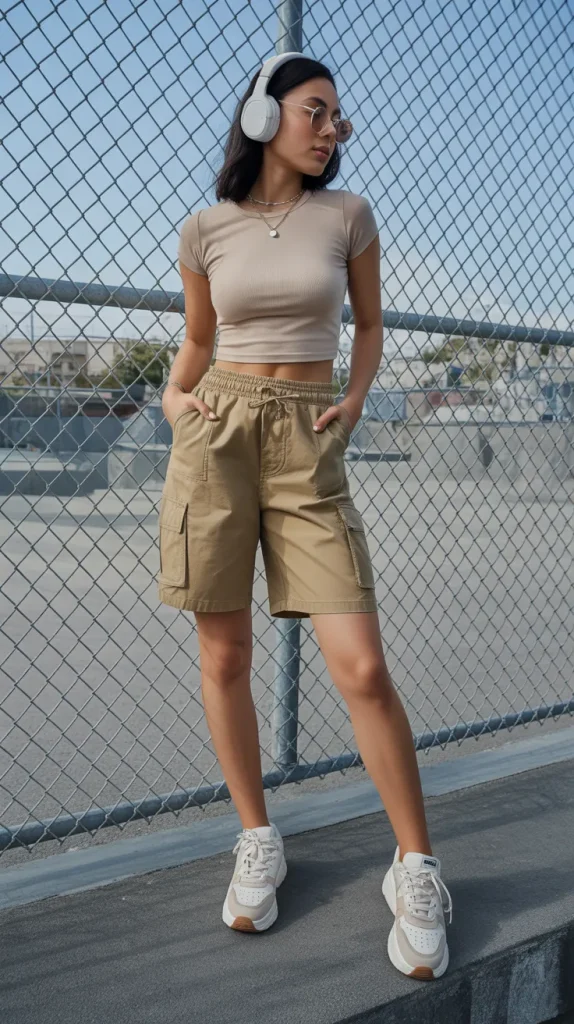 For a youthful and sporty everyday look, khaki cargo shorts with a fitted baby tee are a winning combo. The baby tee keeps things fun and flattering, while chunky sneakers ground the outfit with a bit of street-style flair. Perfect for hanging out at a skate park or casual coffee meetups, this look feels approachable and playful. The khaki shorts work as a neutral, letting you play with bolder colors or graphic prints on the tee. Hoop earrings or a casual crossbody add just the right amount of detail. It’s one of those outfits that feels fresh, cool, and ready for whatever the day brings.