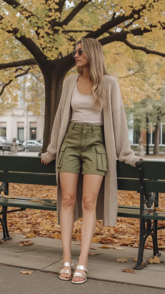 When you want something cozy but stylish, olive cargo shorts with a neutral tank and a beige longline cardigan deliver beautifully. This outfit works for casual park strolls, weekend shopping, or even a laid-back coffee catch-up. Flat sandals keep it easy, while the cardigan provides warmth and flow. The earthy tones tie everything together, making it perfect for autumn afternoons. You can add a belt to cinch the waist or stack bracelets for an extra touch. The mix of shorts and cardigan makes this look versatile across multiple seasons. It’s practical, chic, and endlessly wearable.