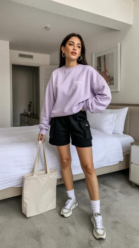 Black cargo shorts paired with an oversized pastel sweatshirt give you that perfect cozy everyday vibe. Sneakers keep the look grounded, while hoop earrings add a hint of polish. This outfit is ideal for lounging at home, heading to the café, or running casual errands. The oversized top softens the structured shorts, making the outfit relaxed without looking sloppy. You can elevate the look by choosing sneakers in a statement color or keeping accessories minimal and sleek. It’s a go-to option for easy days where comfort is the main goal but style still matters.