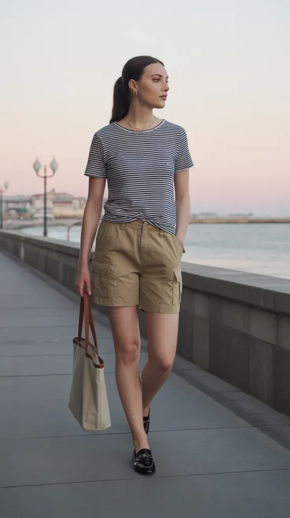 A striped tee tucked into khaki cargo shorts is a simple yet timeless combo. Loafers and a tote bag round off the look, making it perfect for seaside walks, casual errands, or exploring new towns. The stripes add a playful element, while khaki keeps it grounded and versatile. This outfit works across seasons and settings, proving the power of basics. Accessories like a sunhat or bold sunglasses can add more personality. It’s effortless dressing that always feels stylish without needing much thought.