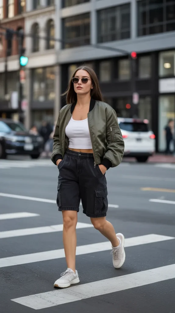 A modern street-style favorite, black cargo shorts with a white tank and cropped bomber jacket create a bold look. Sneakers keep the outfit practical, while hoop earrings or a sleek ponytail add polish. This outfit is perfect for busy city days or nights out with friends. The bomber jacket adds structure, and the cargo shorts provide comfort. Together, they strike the balance between casual and confident. This is a look that doesn’t need much effort but leaves a strong impression.