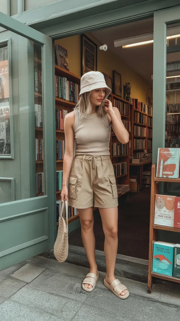 This outfit shows just how easy everyday dressing can be. Khaki cargo shorts with a knit tank and simple slide sandals keep things relaxed but chic. A bucket hat or sunglasses make the outfit summer-ready, while a tote bag ensures practicality. Perfect for afternoons at a bookstore or coffee shop, this outfit embodies easy style. The knit tank adds texture, making the outfit feel more intentional despite its simplicity. It’s an outfit you can rely on when you want comfort without compromising style.