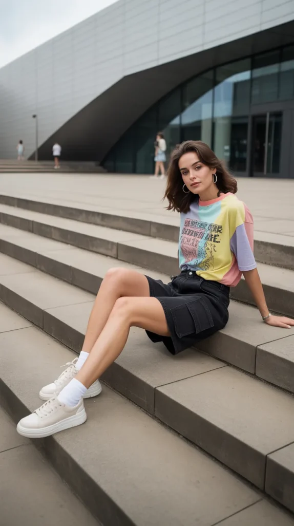 A pair of black cargo shorts styled with a colorful oversized graphic tee gives you a fun and relaxed everyday look. The playful tee softens the structured edge of the shorts, while platform sneakers keep the vibe youthful and trendy. Perfect for hanging out with friends 💛, exploring the city, or lounging outdoors, this look is equal parts comfortable and stylish. The dark shorts anchor the boldness of the tee, allowing you to experiment with brighter shades or eye-catching prints. Hoop earrings or a baseball cap can add an extra playful edge. It’s one of those outfits that feels like second nature but still makes a statement. Easy, fun, and always reliable.