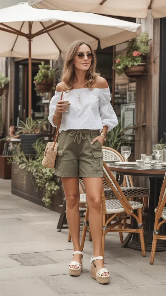 This outfit brings a touch of feminine charm to the ruggedness of cargo shorts. Olive cargo shorts pair beautifully with a white off-shoulder blouse, creating a soft balance between structured and romantic elements. Wedge sandals and a woven crossbody bag add to the earthy, natural vibe. Perfect for outdoor brunches or summer evenings at a rustic café, this look blends casual and chic in the best way possible. The off-shoulder detail keeps it light and playful, 🧡while the earthy tone of the shorts grounds the whole outfit. Add a floppy hat or subtle gold jewelry for an elevated touch. It’s one of those combinations that feels breezy, stylish, and feminine all at once.