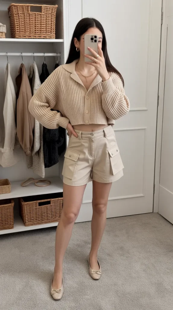 Pairing beige cargo shorts with a cropped knit cardigan creates a cute and cozy vibe that’s perfect for transitional seasons. Ballet flats and gold jewelry keep the outfit polished, while the shorts maintain a casual foundation. This look feels right at home when you’re taking mirror selfies in your cozy room or heading out for a relaxed coffee date. 🤗 The cardigan adds warmth without being too heavy, making it ideal for mild weather. Beige shorts also act as a neutral backdrop, allowing you to experiment with soft pastels or bold shades for the cardigan. Accessories like a small handbag or delicate rings can enhance the outfit even more. It’s easygoing yet effortlessly stylish.