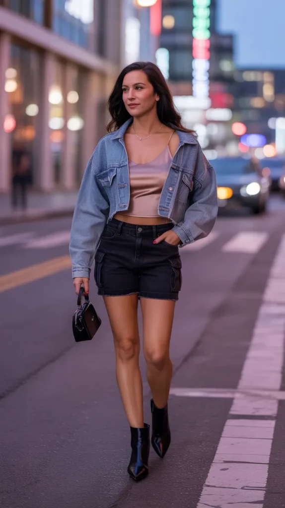 This outfit is a chic take on everyday style. Black cargo shorts paired with a satin tank top add a hint of luxe, while the cropped denim jacket brings in a touch of casual cool. Ankle boots complete the look, giving it an edge that feels both urban and wearable. This outfit is perfect for city strolls, evening drinks, or even a night out with friends. The satin and denim contrast makes the outfit interesting while still being comfortable. Accessories like layered necklaces or a bold lip can instantly dress it up even more. It’s an easy way to turn cargo shorts into a piece that works for more than just casual days.