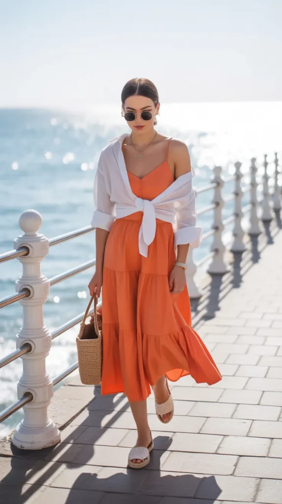 An orange midi dress brings a fun, energetic pop of color that brightens any day. Tying a white shirt over it adds structure and creates a playful layered moment. Espadrilles make the outfit feel beachy and relaxed. It’s a great choice for weekend getaways or sunny outdoor lunches. The whole look feels easy, warm, and full of personality.