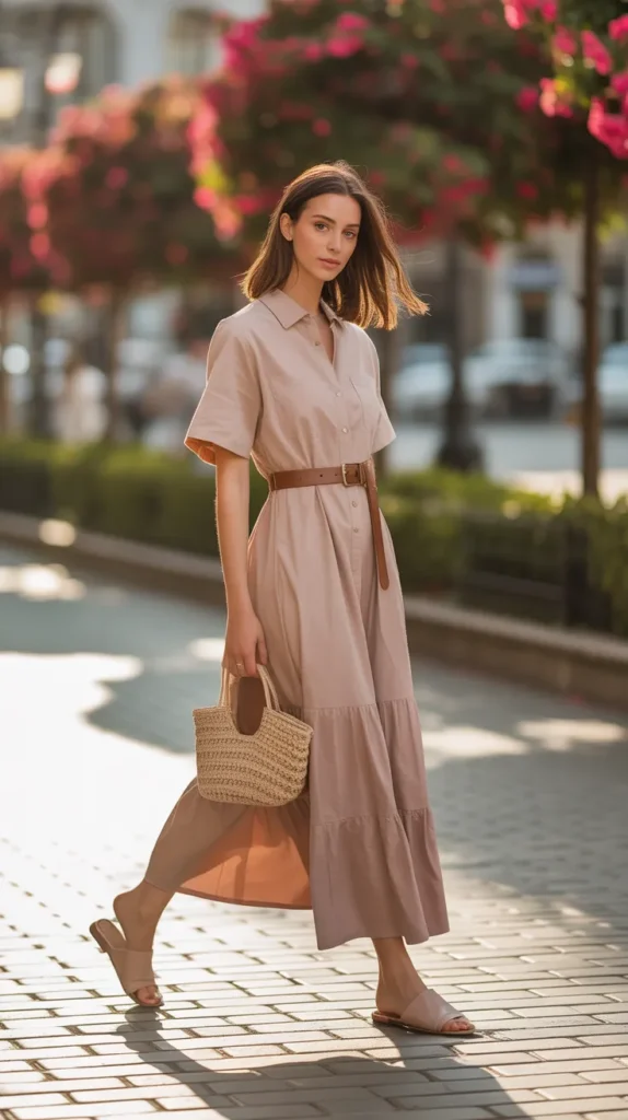 A flowy maxi dress gives you movement and comfort with zero effort. Cinching the waist with a belt adds shape and instantly elevates the silhouette. Flat mules keep the outfit grounded and stylish. Layered necklaces add a soft touch of detail. This look is perfect for days when you want to feel feminine and free.