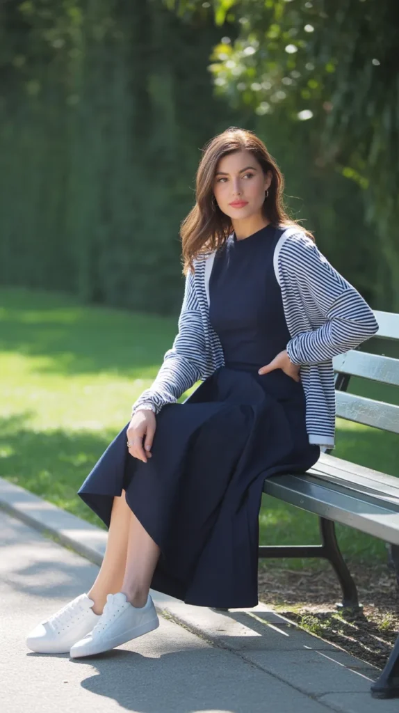 This look gives instant preppy energy in the best way. A navy dress is clean and refined, while the striped sweater tossed over the shoulders adds cozy texture. White sneakers make the outfit casual and comfortable. It’s perfect for weekend walks, brunch dates, or anytime you want to look cute without trying. The whole vibe is soft, relaxed, and polished.
