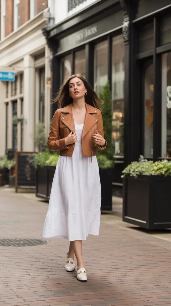 This combo is perfect for transitional weather when you want something soft but still layered. A white linen dress keeps things breezy, while the cropped leather jacket adds structure. Loafers make the outfit practical yet polished. It’s great for fall strolls, light dinners, or daytime outings. The contrast of textures makes the look feel effortlessly elevated.