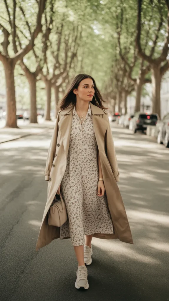 17. Floral Midi Dress with a Trench Coat and Neutral Sneakers