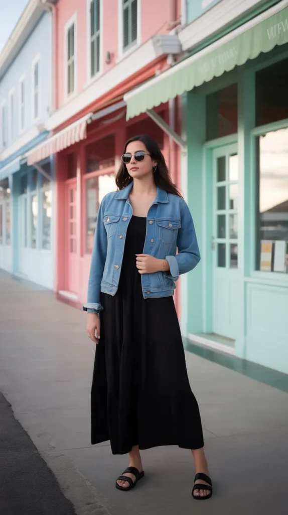 A flowy long black dress has that soft, breezy elegance that always feels good to wear. Add a denim jacket and suddenly you have a casual outfit with personality and structure. Flat sandals keep things laid-back and perfect for warm-weather days. Whether you’re out for brunch or running errands, this look strikes the right balance between comfort and style. It’s simple, flattering, and totally timeless.