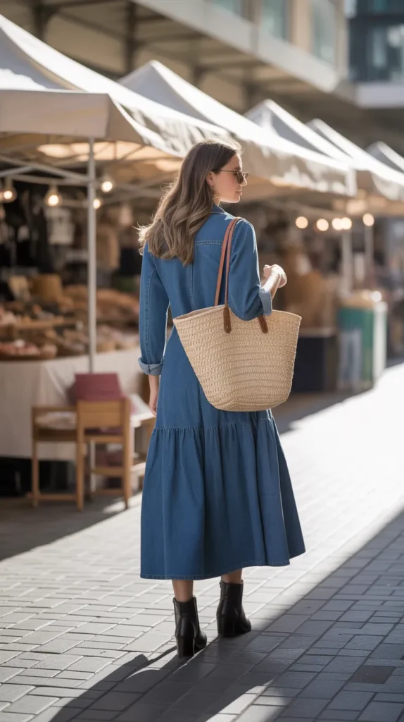 A denim dress is the perfect blend of structured and laid-back, making it a great casual option. Pair it with ankle boots for a little extra edge and height without sacrificing comfort. A straw tote brings in that soft, daytime charm very weekend-ready. This outfit works for everything from brunch to market days. It’s polished but still relaxed, giving you that natural chic feel.