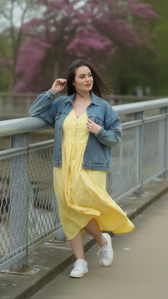 A bright yellow dress instantly brings sunshine to your look it’s cheerful, fun, and super flattering. White sneakers keep the outfit youthful and easy to wear. A cropped denim jacket pulls all the colors together while adding a casual touch. This outfit is perfect for spring strolls, daytime meetups, or any mood-boosting plans. It’s cute, approachable, and full of charming detail.