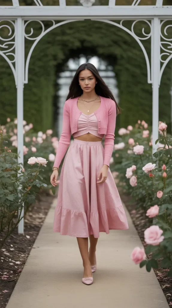 A blush pink dress always brings a sweet, feminine charm that feels soft and approachable. Layering it with a cropped cardigan adds a cozy touch, perfect for slightly chilly days. Ballet flats complete the look with that classic girly elegance. This outfit works for daytime dates, brunch, or any casual moment when you want to feel delicate but comfortable. It’s dreamy, romantic, and super wearable.