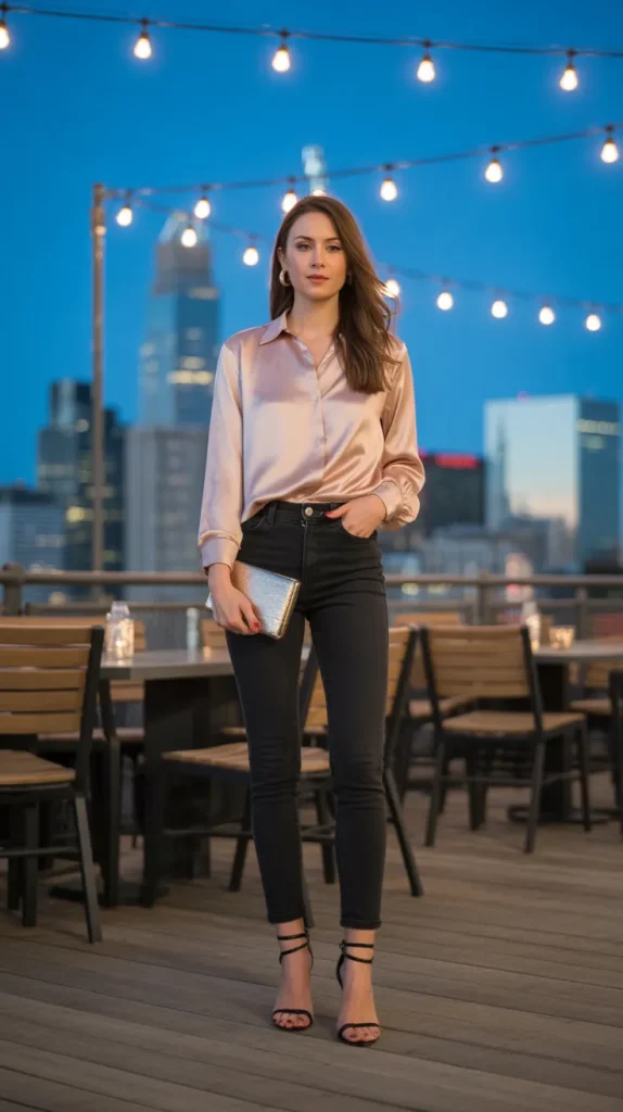 Skinny jeans are a wardrobe classic, and when you pair them with a silk blouse, the look becomes instantly elevated. The satin texture adds a soft shine that contrasts beautifully with denim, creating a balance of casual and chic. Strappy heels make your legs look longer and give the outfit a dressier edge, while a clutch keeps it sleek. Imagine yourself sipping cocktails at a rooftop bar with string lights glowing overhead this outfit feels right at home. ✨ Gold hoops or layered necklaces add just the right sparkle without overwhelming the look. You’ll feel confident knowing this combination works for a date, drinks with friends, or even a last-minute dinner. It’s one of those reliable outfits that makes you look polished with minimal effort.