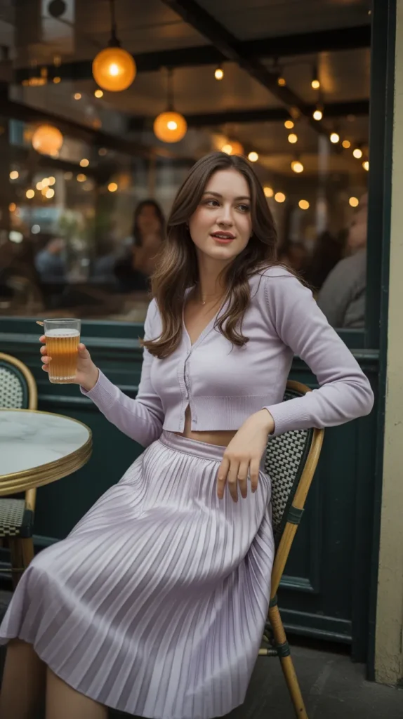 A pleated skirt paired with a cropped cardigan gives off soft, feminine vibes perfect for a dinner date. Add ankle boots or heels depending on your style, and finish with a clutch. Imagine sitting in a cozy café with dim lighting and warm atmosphere this outfit fits right in. ☕ The pleats add movement and texture, while the cardigan makes it approachable and comfortable. It’s an easy way to feel dressed up without going overboard, making it a great choice for casual dinners.