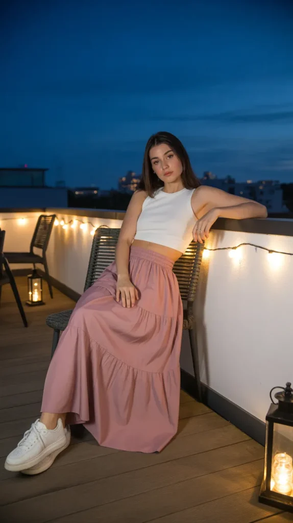 A maxi skirt and cropped tank make for a romantic yet casual pairing. The flowy silhouette feels feminine, while the cropped top adds just the right edge. Add sandals or heels depending on your vibe, and carry a small tote. Picture sitting on a rooftop terrace with string lights and lanterns glowing this is the perfect look. 🌙 Add a denim jacket for cooler nights and simple jewelry to complete the outfit. It’s laid-back but chic, making it great for casual dates that still feel special.