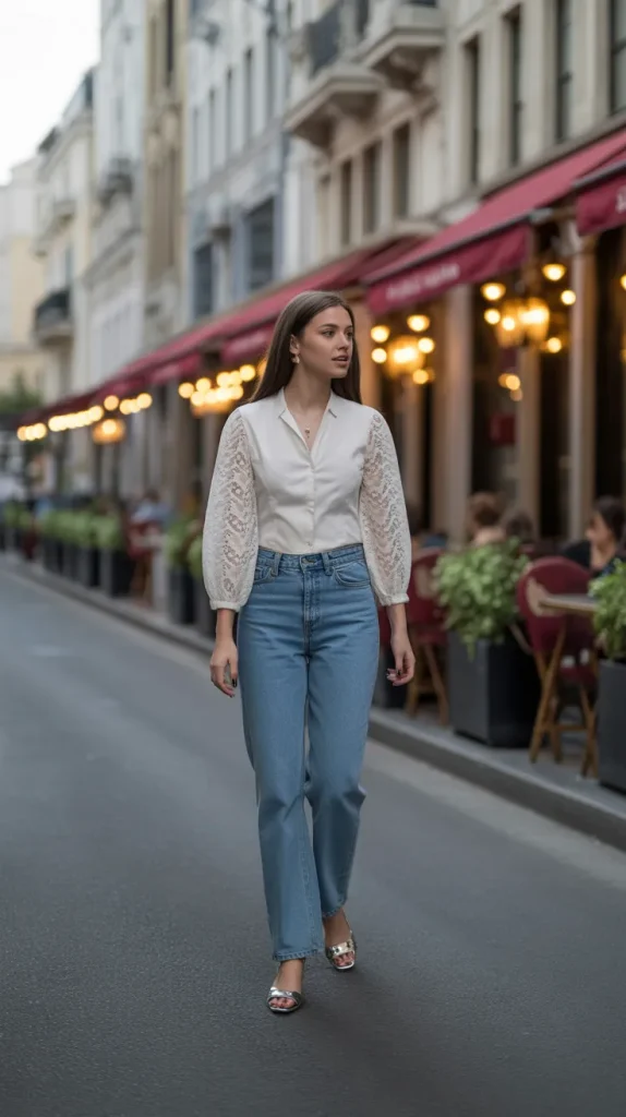 Straight-leg jeans paired with a lace blouse strike a balance of casual and romantic. The lace detail adds softness, while the denim keeps it grounded. Add heeled boots or flats for a stylish finish. Imagine strolling down softly lit streets lined with glowing cafés this outfit fits that scene perfectly. 🌹 A mini bag and delicate earrings complete the look without overcomplicating it. It’s one of those combinations that feels timeless, comfortable, and effortlessly chic.