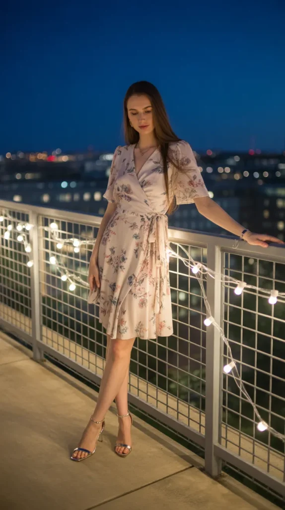 A wrap dress is universally flattering, which makes it the perfect option for a nice date outfit. Paired with strappy heels, it gives you an effortlessly feminine look that works in almost any setting. Imagine standing on a balcony with fairy lights glowing and the city spread out beneath you this outfit captures that kind of romance. 🌸 The wrap style highlights your shape without feeling restrictive, letting you move with ease. A small clutch and simple earrings complete the look, keeping the focus on the dress. It’s one of those pieces you can always rely on when you want to feel polished and pretty without overthinking it.