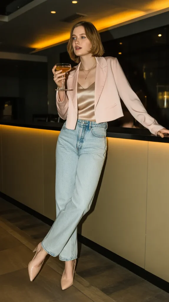 A cropped blazer instantly upgrades a pair of jeans, giving you a chic but casual vibe. Add a silk cami underneath for a touch of elegance and strappy heels to finish it off. This look is perfect for sipping cocktails in a sleek lounge with golden lighting all around. 🍸 It’s polished enough to make you feel confident but relaxed enough to keep things easygoing. A statement necklace or bold earrings can add interest, while a clutch brings everything together. It’s one of those outfits that works for both a night with friends and a casual date, making it a versatile choice you’ll come back to again and again.