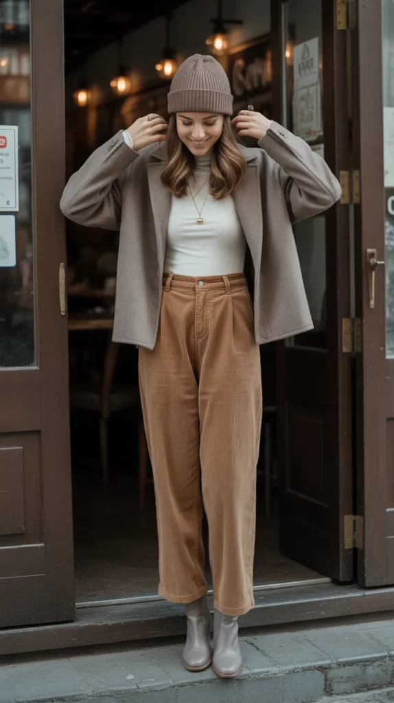 High-waisted corduroy pants paired with a soft turtleneck create retro winter outfit energy. Add a short wool coat, ankle boots, and a knit beanie for a polished finish. This is a casual day outfit that balances comfort and chic style. Casual winter outfits with corduroy always feel seasonal and timeless. Cold weather outfits that work for girls who love a vintage touch.
