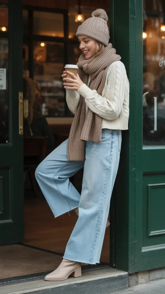 Wide-leg jeans styled with a cable-knit sweater is an instant casual winter outfit classic. Add ankle boots, a pom-pom beanie, and a wool scarf for warmth and charm. Cold weather outfits like this work for brunch, errands, or school runs. A cozy winter outfit that’s effortless but still chic. Cute, casual, and perfect for everyday style.