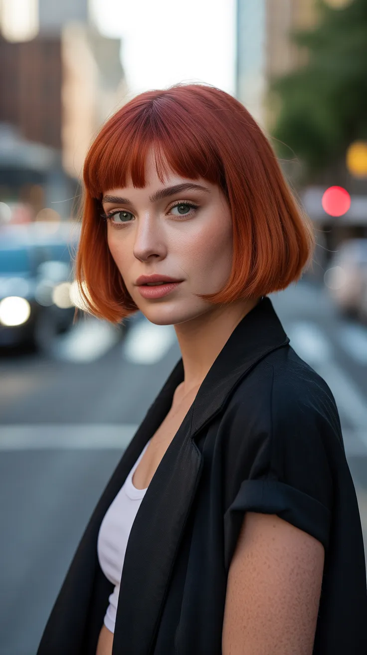 The cinnamon red blunt cut is a striking choice that brings warmth and vibrancy to any look. This hairstyle features a sharp, straight edge that frames the face beautifully, making it a perfect option for those who want a bold statement.