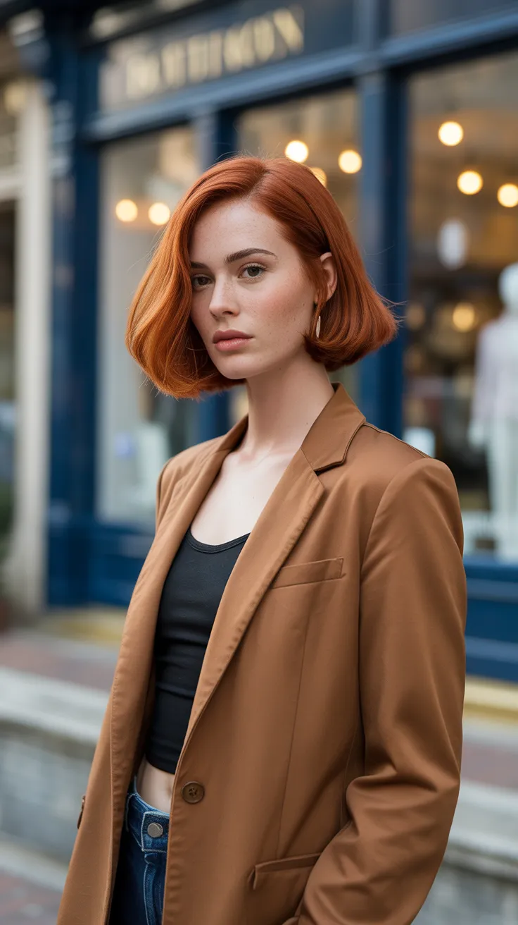 The rich cinnamon hair color adds depth and dimension, creating a stunning contrast against the sleek lines of the cut. This look is not just stylish; it also highlights the natural shine of the hair, making it a popular pick for salon hair looks.