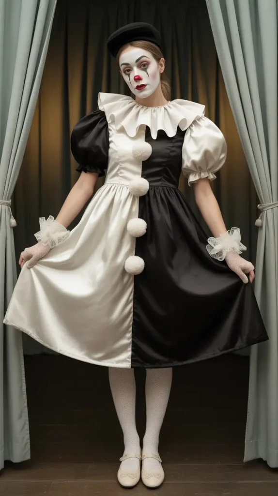 Hereβs a darker but fashion-forward choice: the Gothic Lolita Clown. A black lace dress with striped stockings, miniature hat, and porcelain makeup creates a hauntingly chic vibe. Think Victorian elegance meets spooky fun. Ever noticed how black-and-white costumes always look a little extra polished? This one nails that balance. Itβs perfect if you want your clown Halloween costume to feel stylish rather than over-the-top silly.