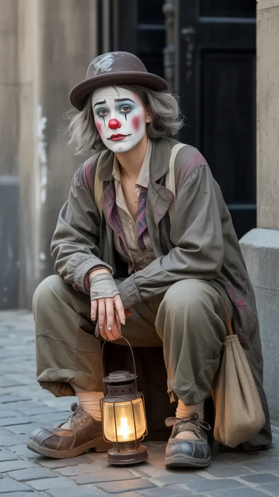 For a nostalgic, character-driven costume, the Sad Hobo Clown is a classic. Picture an oversized patched coat, bowler hat, baggy pants, and smudged makeup. This look carries a story the clown who makes others laugh but looks a little tragic. Isnβt it interesting how costumes with a narrative always feel more engaging? This is a simple yet emotional choice that works beautifully. Itβs a softer take on the clown costume women love for its character depth.