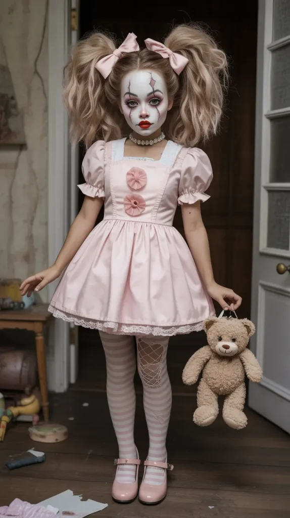 If dolls already freak you out, this one doubles the creepy. A baby-doll dress paired with cracked mask makeup, striped tights, and messy pigtails is unsettling in the best way. It mixes innocent and eerie, which is a Halloween classic. Donβt you love when costumes play on contrasts? This one does that perfectly. For anyone looking for a scarier spin, the clown Halloween costume as a creepy doll is unforgettable.