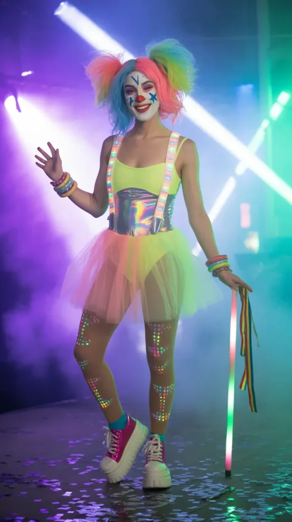 Want neon vibes? Try the Festival Rave Clown. Think neon bodysuit, LED accessories, glitter makeup, and a candy-colored wig. This look is playful, flashy, and totally party-ready. Isnβt it fun when a costume doubles as a rave outfit? Add glow sticks or light-up shoes for even more impact. Itβs basically the EDM version of a clown Halloween costume colorful and chaotic in the best way.